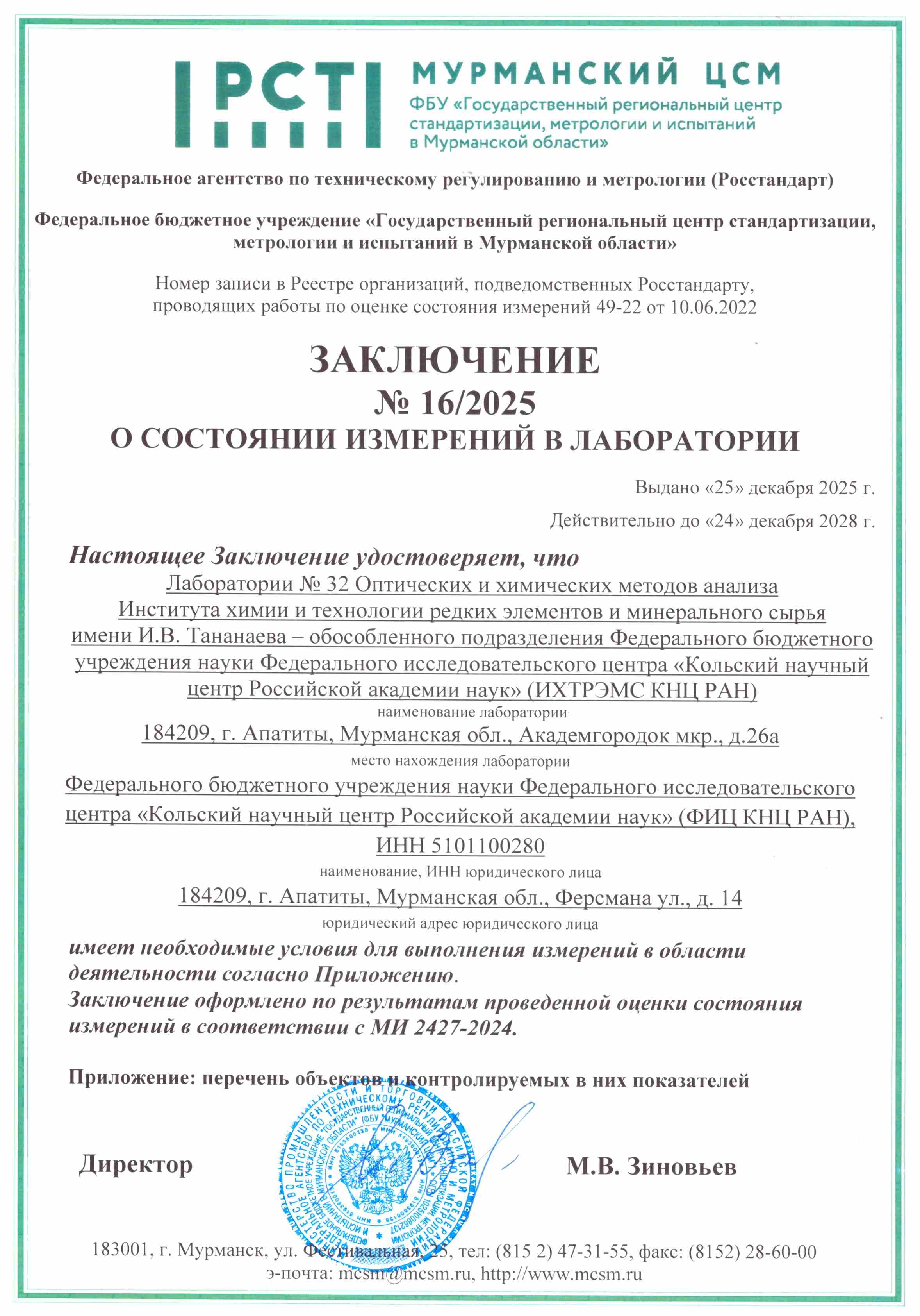 ФБУ «Государственный региональный центр стандартизации, метрологии и испытаний в Мурманской области» (Росстандарт) проводит проверки состояния измерений в лаборатории. В настоящее время действует Заключение № 16/2025 от 25.12.2025 г., действительное до 24.12.2028 г., о наличии условий, необходимых для проведения измерений в закрепленной за лабораторией области деятельности.